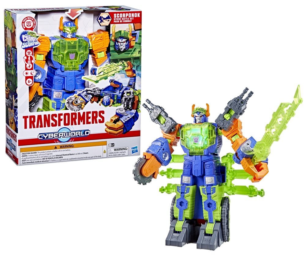 Transform playtime with the Cyber Changers Playset! Figures (sold separately) can ride the hover cycle, battle with the claw, and activate lights and sounds by pressing Scorponok’s head. With spinning arms, fold-out stations, and detachable accessories that convert into a sword and hover cycle, the action never stops!
