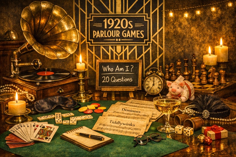 The 1920s were all about lively parlour rooms, roaring laughter, and simple games that brought everyone together. Whether you’re hosting a 1920s Christmas cocktail party, planning a Gatsby‑themed night, or just love a touch of vintage charm, these classic UK games from the era are guaranteed to bring fun, nostalgia, and a little mischief to your gathering.