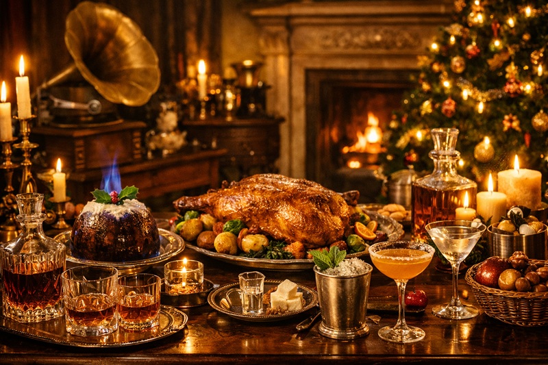No 1920s Christmas was complete without a little tipple. Cocktails like Mint Julep, Sidecar, and Gin Rickey were served after dinner, often mixed with homemade spirits. The stronger the drink, the better the party — and the more laughter around the table.